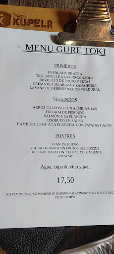 Read moreHemos estado 5 adultos y 2 niñas. Los adultos hemos pedido menú y las niñas chistorra y chipirones. Han tardado una hora en traer el primero, unos huevos revueltos con setas y gambas?, No he visto ninguna, y de segundo taco de ternera, llegó a la hora de pedirlo, frío, sin hacer. Le digo a la camarera que me lo calentará, y lo ha traído en menos de un minuto (de reloj) y seguía frío. He pedido pan y me ha dicho que se había acabado y que estaban "horneando más". No han traído. Las niñas han empezado a comer hora y media después. Los chipirones sólo era rebozado, no había chipirones. Llegamos a los postres, para entonces la camarera había desaparecido, otro camarero nos ha atendido (mucho mejor, por lo menos más rápido) y nos ha comentado que perdonasemos pero q su compañera se había "caído", creo que ha salido huyendo, se la veía sobrepasada, no recordaba lo que le pedíamos. Y de los postres no quedaba qué elegir, sólo tarta de manzana y crema catalana (un 6). A la hora de pagar, el pobre camarero no tenía ni idea de lo que nos habían puesto. Y durante la comida, en la mesa de al lado, han llamado al dueño dos veces porque llevaban dos horas e iban por el primero. En resumen, comida escasa, precio caro (18€ el menú, chipirones 16€ y sólo era rebozado). No vuelvo. Que vaya Chicote a...