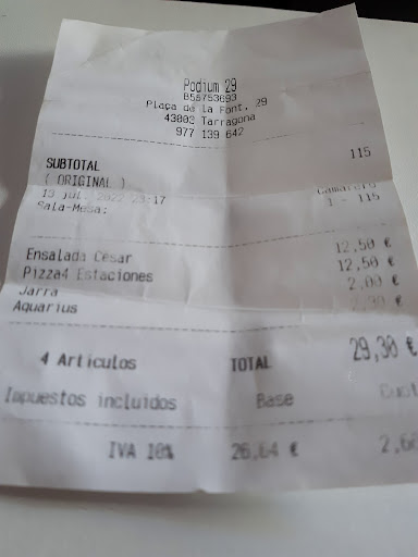 It was a late night (about 1.30 a.m.) and only a few cafes or restaurants were open but we were lucky to find «Podium29» and I absolutely recommend to eat in this restaurant! The fish and pasta were so tasty and I agree about the best “patatas bravas” sauce in the city. You can order a daily menu for 13-14 euro and have a really tasty food in the center of Tarragona. Or you can have a special offer of two drinks and “tapas” (a snack) for 5 euros. Also recommend to try Tarragona’s wine here in this restaurant. The girl Aitana is so kind, helping and positive so we fully enjoyed our dinner. I also liked the friendly atmosphere in this restaurant. Comparing with other places to eat in Tarragona I can say that here you can be sure that they will help to choose the right dish, drink and the food will be fresh and tasty. One of the favorite places to eat and we will surely come again in our next trip...