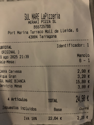 Visité LaPizzeria Sul Mare con grandes expectativas, pero lamentablemente la experiencia fue bastante frustrante. Desde el momento en que llegamos, la falta de organización del personal fue evidente. Pedimos una mesa para acomodarnos y tomar unos Gin Tónics. La idea era cenar en este espacio, pues nos encantó la ubicación. Nos cambiaron de sitio dos veces. La primera vez, nos ubicaron en una mesa sin reserva y les dijimos nuestra intención. Luego, nos movieron a una segunda mesa, pero al poco tiempo nos pidieron que nos levantáramos nuevamente porque también estaba asignada a otros comensales. Lo curioso es que había otras mesas, donde los clientes disfrutaban de su refresco y no cenaban.