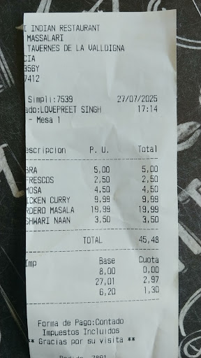 Read moreFuimos hace poco a comer mi pareja y Yo y la verdad es que nos sorprendió bastante, no pensabamos que estaria tan bueno. Hemos provados varios Restaurantes Indios, y este calidad-precio esta muy bien para ser de Tavernes. La atención y el trato fue fenomenal, el camarero era muy simpático, educado y agradable. No saben hablar muy bien Español pero se esfuerzan mucho para aprender y si no entienden algo te lo vuelven a preguntar. Pedimos dos entrantes, dos platos principales, postre, café, y chupitos de Mango. Te regalan de cortesia su pan artesano tipico de la India con 3 salsas. Los platos principales estaban buenisimos sobretodo el Pollo con mango y coco, y todos van acompañados de arroz basmati, hubiera repetido. Estava todo muy bueno y no es caro esta super bien. Nos gusto mucho y volveremos a repetir!! Por poner una pega, haría una sugerencia y es que los cuencos de comida fueran un poco más grandes y que hicieran mas...