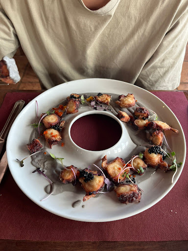 This one is a mixed bag. Some of the foods had interesting and different flavours, quite unique. The servers were really nice and the place had a quiet homey atmosphere with great views of the valley. However for me it fell apart when I receiced a dish with overpowering smoked caviar for the third time in a row, paired with seafood third time in a row. I like caviar and seafood, but this combination was just too much, the aroma of the smokey caviar pushed trough all the other flavours in all three dishes for me and it felt overused, same with truffles (and I looove truffles). Most of the dishes were absolutely dominated by one singulae flavour which, even if you like, gets old really fast and the food is hard to finish. My greatest dissapointment was the fried octopus (again, I love octopus, I love fried food), but this was very unbalanced for me personally. The octopus was not on the soft side to say the least, on top of it it was quite greasy and very heavy. The tuna steak was great, the tomato/mango soup and potato starter was also quite interesting, so it was not all terrible. The scallop was not the best Ive had, not the worst either, but the super smokey caviar didnt help. I found it an interesting touch of novelty in the first dish, but after that, we couldnt smell anything else that was on the plates, completely overshadowed by the caviar. It was passable on its own, but due to me having high expectations from michelin guide, it was a...