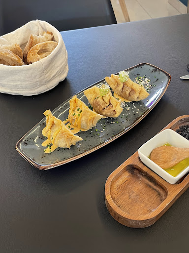 Read moreFuimos por un bonos premium con menú ilimitado. Todo lo que probamos estaba muy rico, la comida estaba elaborada con mimo y esmero. Al tratarse de menú ilimitado, hasta que no acababas un plato no te servían el siguiente, lo cual me parece genial para no tirar comida innecesariamente. Pero como experiencia en sí, sales con ganas de probar más variedad de platos que tienen en la carta. Hay platos cuyas raciones eran a nuestro juicio demasiado abundantes y acababan empalagando un poco a pesar de saber bien. Éramos 2 personas y nos pusieron: 4 gyozas: 2 de verduras salteadas y 2 de costilla. Muy ricas, pero las mejores las de costilla, son una delicatessen en boca. Un cuenco de nachos con aguacate, cebolla y queso. Estaban buenos, pero la cantidad grande para poder disfrutar del resto de platos. 2 tacos de pollo rebozado, con aguacate, perejil y cebolla de guayonje. Nos encantó. Berenjena en tempura con topping de miel y gofio. Este si que era una ración excesiva a nuestro juicio, porque entre el rebozado y el gofio, resultaba muy pesado de digerir y suspirabas al tratar de terminarlo para probar el siguiente plato. Que conste que las berenjenas estaban muy sabrosas y la combinación se daba muy bien, pero en menor cantidad se hubiera disfrutado más. Huevos rotos con foie de pato y boletus con una importante base de papas, que aunque tratamos de acabar, nos resultó imposible porque estábamos ya un poco saturados de hidratos de carbono. El siguiente plato hubiese sido el famoso risotto que elaboran ellos, pero no llegamos a probarlo.