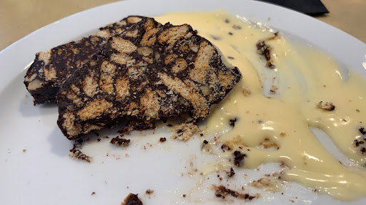 Finalizando con el postre, he de confesar que aquí nos coronamos, pues todos los postres eran caseros y el café con el que trabajan es el maravilloso “Borbone” (y su versión descafeinada), servido en su maravillosa taza. El postre señero es el tiramisú (servido en vaso), donde destacaba la cremosidad de su galleta y el cual no era para nada empalagoso. Pero, en mi caso particular, quizá el postre que me más me llamó la atención fue el salchichón de chocolate, galleta y almendras y crema de mascarpone. Mi sueño hecho realidad: medallones de media pulgada de grosor de buen chocolate que si por su compactación llegara a considerarse un postre seco, la crema que lo acompaña lo hidrataría en su justa medida.