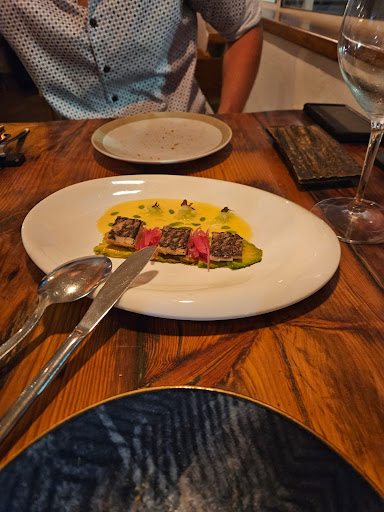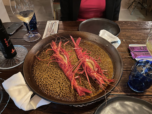 We went here for my boyfriend’s birthday because we saw this restaurant recommended by the Michelin guide. It’s located in a compound with other restaurants and shops, parking is easy accessible. We waited outside while they sent someone to pick us up and seat us. The interior and vibe in the restaurant is cozy-classy and the table set super stylish. A waiter came and introduced himself by name but turned out not to be our “dedicated” waiter in the end. What threw us off and dimmed the experience a bit at the beginning was the fact that they had no menu card but only a QR code that we had to scan. So we started the evening off by looking at our phones and trying to decipher the (very original) menu. It is mandatory to have a starter and a main, which is fine, since they have a handful of inventive starters and 3 different main courses. We picked the potato cream with octopus and the prawn tar tar as starters and the paella with giant canary prawns to share. The starters looked absolutely beautiful and tasted super unique. it’s a very unique and local experience and absolutely worth it. While the starters came with (somewhat) of an explaination of the waitress, the main arrived (served from yet another waiter) with a very brief (and Spanish) explanation on how to disassemble the prawn. We would have loved to hear more about the dish, its origin, the rarity of the prawn and why the prawn was raw. (Which we found out while eating it as it was not specified in the menu) That said; it was delicious! The caramelized rice was amazing and the raw, giant prawn was so soft and fresh, it basically melted in our mouths. Portions are enough to fill you up without stuffing. We had the local white wine which was served generously and whose salty, earthy notes complemented the dished very well. As a dessert we had the husk meringue with corn mouse and I can confidently say that I have never had such a surprising dessert. It combines sweet and savory flavours in such a way that every bite tastes different. Another interesting part of the dinner was the sparking water, which is a natural mineral water that has never seen the light. Maybe not necessary but indeed very cool! All in all it was a super cool experience. I would have loved to learn more about the dishes and have maybe one dedicated waiter who takes care of us but other than that the...
