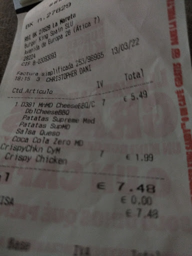 Read moreEl peor Burger King en el que he comido y para variar no soy de BK, primero nos dijo una de las encargadas que estaba vigente el 2x7, después de estar unos 10 minutos intentando dar donde estaba la supuesta promoción en la máquina de pedido, tras volverme a acercar a las cajas y volver a preguntar me dicen que creen que no está vigente, mirándose entre ellos con caras de circunstancias, desistimos de la máquina de pedido y decidimos pedir directamente al empleado en caja, cuando se lo comunico me contesta que esperemos fuera, con 4 personas sin distancia de seguridad en las máquinas de pedido, le contestó que no es posible, que voy a esperar donde me encontraba que yo sí estaba guardando la distancia social, cuando nos toca nos dice que no está vigente y ya le digo que quiero hablar con su encargada, la cual me explica que son ofertas que se activan y desactivan por días, vamos una publicidad engañosa que da hasta sentimiento, en este momento, una pareja que habían atendido antes que a mí ve como uno de los encargados viene a la caja se pone a manejar dinero, suelta el comentario jocoso con los compañeros y se va directamente a seguir haciendo la hamburguesa de sus menus, el cual monto el espectáculo propio de la situación, resumiendo, pues tras terminar de hablar con la encargada, recogí mi comida y me vine a comer a mi casa, y sorpresa pedimos el mismo menú, mi novia y yo y llegó un menú con una hamburguesa de pollo y el otro de carne, conclusión NO VUELVO A COMER EN EL...