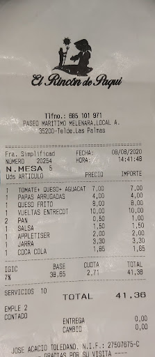 Volvimos a almorzar en el Rincón de Paqui creo que por última vez, el 23 de agosto .....buena atención al cliente, rica ensalada con queso frito, buen escaldón de gofio, ....¡¡¡PEROOOOO, !!!!! un Cherne a la espalda a precio de ORO. 27 euros un pescado que no creo que llegara a los 600 g, quizás un poco más, era pequeño.....no quiero especular pero aunque sea fresco no creo que aquel pescado, aún siendo Cherne, costara la friolera de 27 euros. Simplemente se les...