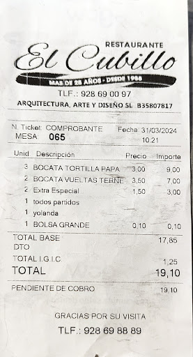 Pongo una estrella por obligación ya que no me dejan comentar si no clasificó con la estrella , he tendido varias experiencias en este lugar pero ya la última colmó mi paciencia,la primera fue hace un año aproximadamente con unos bocadillos de calamares ,al llegar al lugar me encuentro que en el bocadillo había solo en cada mitad dos calamares y completamente vacío,llamo y le comento a la chica lo que me había pasado ,ella por teléfono fue muy amable y me dijo que me pasara cuándo quisiera para ella poder recompensarme con un nuevo pedido ...la cosa no queda en eso volvemos mi madre y yo para desayunar una mañana y yo me pido un poquito de pechuga a la plancha en un plato el cuál tenía 3 trozos nada las y me habían cobrado casi 8 euros ?una cosa brutal por solo 3 pechugas...no queda en eso que volvemos a desayunar una amiga y yo porque habíamos ido al veterinario a dejar a la perra y teníamos que volver,lo más cerca era tomarnos algo en el cubillo,muy mala idea la mía mi amiga se pidió un cortado y una tortilla francesa con jamón y queso sin pan sola ,y yo un zumo y un bocadillo de pata ,pues sabes cuanto me salio la broma que lo puse hasta en mis historias de instg 19 euros el desayuno ,me dio vergüenza decirles si los huevos eran de oro ya que en mi vida me había pasado con ese precio compro 2 cartones de 30 huevos casi ...para colmo trabajo al lado y mis compañeros ayer querían comer en el cubillo les dije señores 🤦🏾 no a mi me ha pasado todo esto que les conté y aún así fueron ,saben que ? Nuevamente volví comi y otra vez el sablazo 14 euros por 2 bocadillos de pata ? Señores ni el yazmina que es más conocido ,te cobran 3.20 el bocadillo ,1.50 el queso tierno y 0,50 la mayonesa? Enserio encima estaba seco y sabía mal .....más nunca ahora si que no ,ah mis compañeros fliparon con lo que estos le cobraron y tampoco van a volver y encima el trato pésimo...un saludo 👋 carotas !...