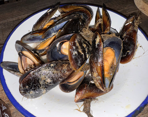 La comida y la bebida: Sangría, 2,90€, no deben ser ni 200 ml. Rica, cantidad escasísima. Mejillones a la brasa, 8€. 17 mejillones, de los cuales 4 no pudimos comerlos porque no se les dio el tiempo suficiente en la brasa, pero te los ponen igual. El resto, de sabor muy sabrosos. Sardinas a la brasa, 11€. 5 unidades, muy pequeñas pero muy ricas. Ración muy escasa. Churrasco de cerdo, 11,90€. Bien de abundancia, quizá hubiese admitido 5 minutillos más de fuego, porque venía justito hecho. Chorizo rojo, 2€, espectacular, de lo mejor de la comida. Las patatas fritas, 5,90€ (ya les llega) eran una bandeja bien grande y estaban bien.