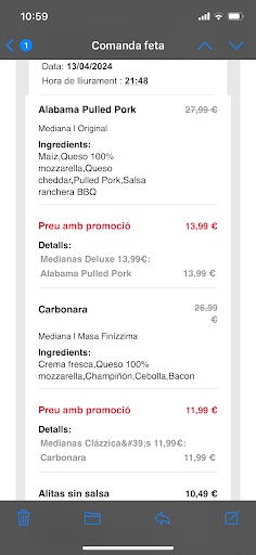Cuál fue mi sorpresa y enfado cuando, al abrir las cajas, ninguna de las pizzas se correspondía con el pedido y además a una le faltaban trozos (estaba empezada). Bajé a toda prisa para avisar al repartidor pero este, a pesar de verme, se subió a la moto y se fué. Volví a llamar al local (para entonces ya eran las 22.44h) y les expliqué lo sucedido a lo que la encargada me ofreció “volverme a la mandar el pedido de forma urgente o que el próximo pedido me saliera gratuito” escogí lo primero y esta vez si, era lo que yo había pedido.