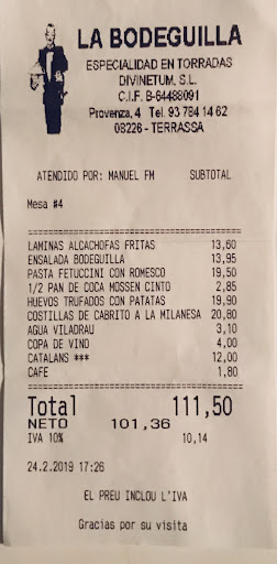 Gran qualitat i bon gust, però... Restaurant elegant, discret, ben decorat, sense estridències, ubicat a Terrassa i per molts el millor restaurant de la ciutat. El menjar, sense concessions a les innovacions a la cuina, és de tipus tradicional mediterrani i català, molt ben elaborat, amb bona matèria primera i de qualitat. La atenció del personal de sala és correcte. Amb seguretat menjareu molt bé. Però passem ara a tot allò que no ens ha agradat gens. En primer lloc el temps d'espera entre plats que l'hem considerat totalment inadmisible en un restaurant que vol posicionar-se al top de Terrassa; dues hores i quart per menjar dos persones, sense postre i un cafè ens va semblar molt poc adequat. Si nosaltres volem un ritme lent, ja menjarem lentament i farem sobretaula, ara bé si quan et treuen els plats dels primers i els segons tarden més de mitja hora en servir-los, aleshores tenim un problema. En segon lloc els preus que ens van generar la sensació de que ens prenien el pèl. Indubtablement que la qualitat és paga, això ho saben, però tot té límits. A la meva parella que va demanar uns encenalls de carxofa per compartir entre els dos, una amanida de la casa i uns ous farrats amb patates fregides perfumats amb una mica de tòfona, una ampolla de vi de 12€ per compartir i una d'aigua, sense postre, ni café, ni pa, el dinar li va sortir, repartint el preu de les carxofes el vi i l'aigua, per 48,20€. Tal com ella ho va descriure, pagar quasi 50€ per quatre carxofes, una amanida i tres ous farrats amb patates fregides, tot regat amb vi baratet i aigua, per bona que sigui la qualitat, és una presa de pèl en tota regla. Us adjunto una foto de la factura dels 111,50€ que vam pagar pel dinar de dues persones, per tal de veure que realment va ser així. El restaurant es bo, el menjar també i tenen bones materies primeres,...però nosaltres preferim buscar altres llocs igual o més agradables on es mengi igual de bé i pagant una fracció del preu de...