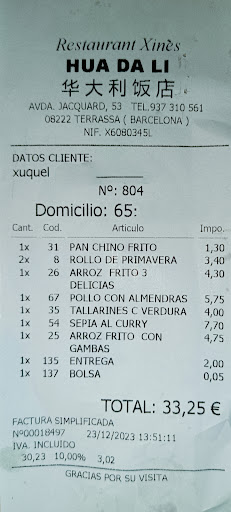 Read moreNo pidan comida a entregar en casa. Los problemas para escuchar a quien atiende el teléfono son más que importantes, además no presta atención a lo que se le está diciendo pues mantiene otras conversaciones con el personal del local mientras atiende el teléfono así que, tendréis serios problemas para saber cuándo os hablan a vosotros o a la gente en el local. Además corréis el riesgo de que llegue la mitad de la comida fuera de los envases (pedido anterior al de hoy) ó que la salsa se salga totalmente de la fiambrera, dejando todos los demás envases chorreando o empapando otros productos y la comida de esa fiambrera totalmente seca e insípida. Esto no ha sucedido sólo una vez, sino que se repite desde que usan repartidores externos... Por cierto, si he de pagar por la entrega, el trabajo se ha de hacer correctamente. Adjunto fotos de la bolsa de hoy y de la factura...