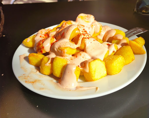 After our 14km hike in the hills we came here for a beer and food. We were a little early for food but we had a cold beer on the terrace. We ordered, one bocidillo with chicken and pickles with mayonnaise. Another bocidillo with lettuce, bacon and egg. Both were good. We had 4 large beers and 2 large bocidillos for...