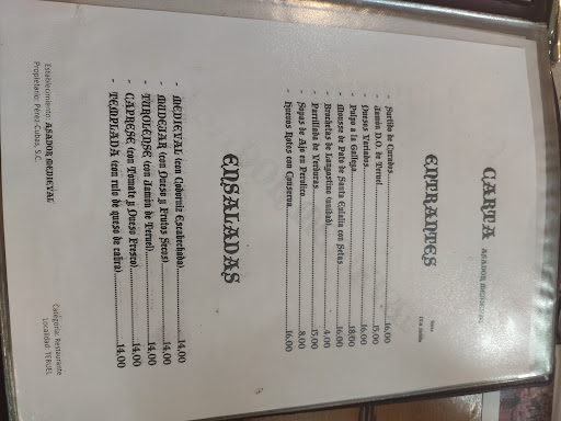Read moreRestaurante en el centro de Teruel con temática medieval especializado en comidas a la brasa. Tienen carta y opción de menú del día (bebida se paga aparte) por 14,5€ entre semana y 17€ el fin de semana. El camarero que nos atendió fue amable. En nuestro caso optamos por el menú y probamos: -Ensaladilla rusa: el plato que menos gustó. Tenía un sabor demasiado avinagrado y le sobraba aceite por todos lados. El tomate muy muy bueno -Crepe de espinacas: el sabor del relleno está muy bueno, pero punto un poco quemado por arriba y por abajo y exceso de aceite que no necesita para nada -Musaka: sabor decente que en general nos gustó -Pollo a la brasa: el plato que más nos gustó, muy buen sabor y textura del pollo -Calamares a la andaluza: buen sabor y buena cantidad pero otra vez con exceso de aceite por encima -Tarta de queso: de sabor bastante bien pero con una textura muy cuajada. Le quitaría (o pondría en un lateral)el sirope porque no lo necesita para nada En líneas generales de lo que probamos, opción decente en cuanto a precio de menú del día donde destacan sus platos en la brasa pero habría que darle una vuelta a los entrantes y no poner tanto aceite...