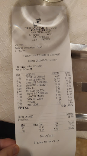 Read moreFuimos porque en google aparece como la segunda mejor pizzería de Teruel, y tengo que decir que estuvo buenísimo. De entrante probamos las croquetas de jamón y carne, es una muy buena combinación y nos gustó mucho, cremosas por dentro y crujientes por fuera y nada aceitosas. De principales pedimos una pizza pollo barbacoa y unos espaguetis carbonara. La pizza de 10, masa fina y crujiente, con buena cantidad de salsa bbq, queso y carne. Los espaguetis son los mejores que he probado en mi vida, estaban al dente con huevo, nata, con sabor intenso a queso parmesano y "guanciale" (bacon). Y de postre recomiendo el tiramisú, 100% casero e italiano, el mejor que he probado. Sin embargo la tarta de queso no es la de horno, y tampoco tiene mucho sabor a queso, deja mucho que desear. Y las trufas de chocolate son grandes para comer de un bocado y empalagosas. En total adjunto foto del precio final, éramos 4 personas y salimos a 22€ por persona,...