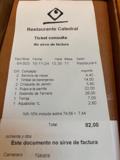 Teníamos reserva a las 14:00 y como se aprecia en el ticket pagamos a las 15:39, algo excesivo para 2 personas y la cantidad de comida que hemos pedido, teniendo en cuenta además que cuando llegamos solo había un par de parejas más.