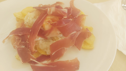 Read moreMuy flojo el almuerzo que hicimos en la terraza de este restaurante. No se si es peor el menú que pidió mi acompañante que fue bastante justito para el precio que tenía o las patatas bravas que pedí, empezando por esto último no sé porque en muchos sitios se empeñan en llamarle bravas a algo que no lo son, en primer lugar las patatas congeladas ( imperdonable) y más aún cuando la guarnición del plato de carne que pidió mi acompañante llevaba patatas panaderas caseras ( muy ricas por cierto) y después las salsas simplemente una mayonesa mezclada con una "brava" de bote con pimentón a mansalva por encima que a veces es hasta molesto. Eso no es una salsa brava ni unas patatas bravas y veo que además está a medio terminar y que mejorando algunas cosas podría ser un buen plato pero tal y como son ahora no hay quien se lo coma y sería mejor que lo quitaran. Igual con alioli mejoraría o subiendo un poco el picante, me hubiera gustado hablar con el genio del plato porque se volvió tal cual a la cocina. Respecto al menú la ensalada estaba pasada de vinagre, la carne y el postre correctos. Se ve un sitio turístico igual que los establecimientos que lo rodean, correcto si...