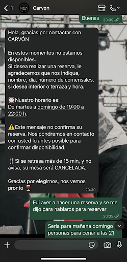 Posteriormente, al intentar formalizar la reserva para un grupo de seis personas, se nos informó que no era posible realizarla en persona y que debíamos hacerlo exclusivamente a través de WhatsApp. Este requisito resulta, cuanto menos, desconcertante, especialmente en un contexto donde la atención presencial debería ser una opción viable. Nos preguntamos cómo podría una persona mayor o alguien sin acceso a esta aplicación disfrutar de los servicios del restaurante, lo cual denota una falta de accesibilidad y consideración hacia los clientes.