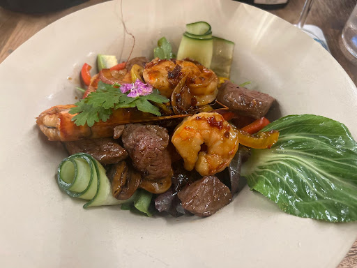 We had the Mesa burger, and the Cod. Atmosphere was friendly and cozy. The Mesa burger came with fries and a side salad, that looked a little limp. The cod came with pistachio & pesto crust and vegetables, and sauce and was very nice. The service was fairly attentive and friendly. One thing we noticed was a greasy salt/pepper mill that hadn't been cleaned between services. On the whole a nice evening meal, although the burger was not to my taste, the wine...