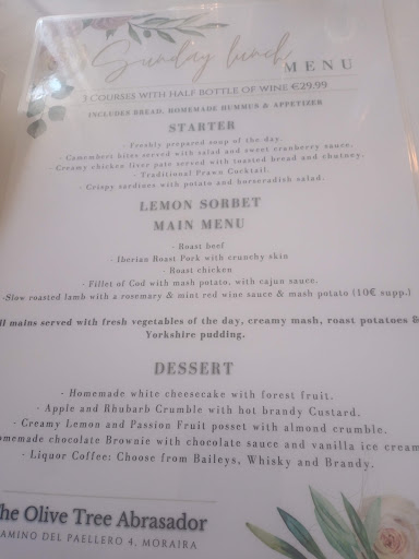 Read moreJust had a meal at The Olive Tree in Moraira, and it was very disappointing. We used to go there all the time 10+ years ago when the kids were little and we had baby sitters. It used to be great, the highlight of the holidays. Now the kids have grown up and moved out we went back as a couple, planned it towards the end of the holiday as a treat, but oh how it's changed. It took 1 hour for our meals to come out, when they did they were not very warm, and almost all fat with little meat on my beef rib. When I mentioned this to the waiter (who I believe was the manager) he gave me an excuse about having to cook every thing from scratch. No apology and didn't seem bothered that we'd had a poor meal, cold food and bad service. There were a few tables who were really chatty with the staff, looked like regulars with tab accounts. They managed to get seated, and get three courses in before our food came out (as well as the tables around us). If you are not a regular the service will...