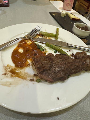 Ordered medium to rare Glazed tuna with pineapple. It comes with sauteed vegetables in soy and is completed with sliced potatoes and paper sauce. The vegetables were extremely salty probably because of the soy although a good chef won't allow the salty soy sauce to spoil the food that much hence I mention the vegetables on their own. The amount of the vegetables was no more than a big soup spoon. The tuna was well done instead of mid-rare as ordered. Strangely enough just on its own the tuna tasted even saltier than the vegetables! Because of the presence of the pineapple on the menu I was expecting that the tuna would be glazed in some sort of sweet glaze and the sweetness would come from the pineapple. There was no trace of sweetness on the tuna. I couldn't taste pineapple no where on my dish. The potatoes happen to be a cube of stacked-up slices of potatoes no bigger than a single uncut average size potato. The paper sauce was a tiny splash, just enough to bring some colour on the plate than to be enough to enhance the tuna flavour. When I was reading the menu, I got the impression that I was about to experience the sweet, the salty and the peppery taste with my tuna. It was a complete disappointment as apart from my tuna being overcooked the overall flavour of this dish was just salt. Strongly salty! This place claims to a fine dining but from my own experience I find it pretty average. The waiters are smiley and friendly but after a few questions you may find that their English starts and stops with what words are already used on the menu. Forget about asking questions about your wine...it is likely that you get a smile back instead of answer. In fairness, you are offered to taste the vino and send it back if you don't like it. However, if you are after certain flavour you may have to try few bottles as asking the waiters about it may be a "causa perdutta". I sent the dish back and the manager explained to me that the salty taste comes from the soy sauce. I was offered a replacement. The replacement tuna was perfectly cooked to medium rare but again lacking the pineapple glaze and the flavour. The vegetables were even less as quantity than the first time. The paper sauce somehow was none existent.