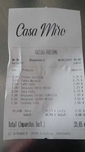 Read moreEl pasado Día de la Hispanidad, Virgen del Pilar, visitando las Vegas de Aranjuez, a la hora de comer, fuimos a dar en Titulcia con el restaurante CASA MIRO. Y en buena hora, he de decir. El local es muy acogedor, con una decoración muy rural que casi se diría museo etnográfico. A mí, personalmente, me encanta, por lo cual estuve muy a gusto. El trato del personal, todo femenino, muy amable y solícito. El servicio, rápido y eficaz. Y eso que el local estaba lleno. Y las viandas, diría que lo mejor. Comida castellana, rotunda, muy bien cocinada y servida. En nuestro caso, aparte de un rico plato de patatas fritas, una suculenta sopa castellana, una paletilla de cordero lechal magníficamente cocinada y un bacalao a la riojana del que sólo pudimos con la mitad. Ayer dimos cuenta en casa de lo que sobró. De postre, una riquísima tarta de manzana y un cornete industrial. En resumen, una estupenda experiencia en este pueblo, Titulcia, cargado de historia y...