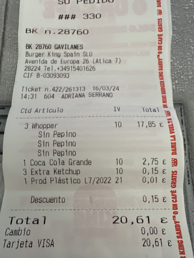 Read moreMe encantaba ir allí por que a comparación del que está en puerta de Toledo , el servicio era bueno. Resulta que eran las 00:30 cuando nos acercamos , mi niña , mi marido y yo.. cuando nos bajamos , vimos a un empleado limpiando , así que al bajarnos miramos los carteles de la puerta, en el que ponía que cerraban a la 01:30. Entramos y empezamos a pedir en las máquinas … cuando nos llega una empleada y nos dice que tenemos que ponerlo para llevar por que en 15/10 minutos cerraban! Al llegar al mostrados le comentamos a la chica que , deberían de cambiar el cartel ya que están engañando al cliente. Me dio la razón, después la comenté que claro habíamos pedido un menú mediano por el tema de poder rellenar el vaso las veces que quisiéramos, y como lo íbamos hacer si nos tocaba comernos la hamburguesa fuera en la calle .. la dije que si podía darme dos vasos a cada uno y nos dijo que no, que a ellos les cuentan los vasos .. la verdad que fatal ! Mi marido pidió una hoja de reclamaciones… fue a por ella . Estuvimos esperando 15 minutos .. y a otra compañera la dijimos que no buscaran nada que nos íbamos y la contestación de esa chica fue ; lo siento es que está todo desorganizado y no están actualizadas las cosas...