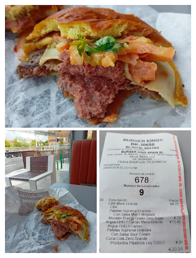 El peor Burger King en el que hemos estado, con muchísima diferencia. Primero, la tardanza en servir el pedido. Pese a ser las dos y media de la tarde de un domingo y haber menos de media entrada, tardaron una eternidad en procesar el pedido y hubo que recogerlo en mostrador cuando deberían llevarlo a la mesa, que para eso están los numeros identificadores. Con la bandeja en la mesa, la cosa va a peor. Las patatas están claramente recalentadas. Algunas, una vez, otras, dos o tres y el resto, juraría que se sirvieron el día antes. Sin sabor, sin consistencia, ni con las salsas se mejoró el despropósito. Lo peor llega con la hamburguesa Angus. Fantástica, si te gusta el carpaccio de carne, nefasta si te gustan las hamburguesas. Ligeramente quemada por fuera, CRUDA por dentro y templada, tirando a fría, es decir, asquerosamente incomible. El pan, se descascarillaba solo, más recalentamiento. En la vida hemos visto cosa igual. Resultado: 22,81 € tirados a la basura y Burger King en...