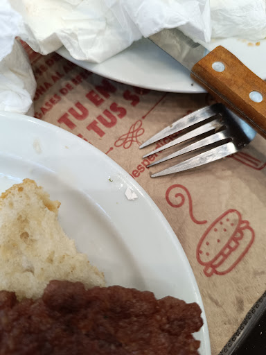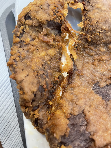 Read moreEl escalope de ternera es una bazofia, tal cual, me cambiaron el plato una vez porque me lo dieron negro de lo quemado que estaba y bañado en aceite que olía mucho y la segunda no quedo tan negro pero tampoco estaba bien , pero se negaron a volver a cambiarlo ya que según el encargado la ternera es dura y negra, y que no iban a tirar otro escalope a la basura ( el error de hacerlo mal al parecer nunca es de ellos , no es mi problema que no sepan cocinar). Que el color era normal, y que estaba bañado en aceite quemado porque era de todo el día, que es normal para ellos, sin dejarme hablar y cortándome constantemente. El filete no me lo comí, simplemente me comí las patatas y el huevo, el filete se lo llevé a mi perro para que al menos los 13,50 que te clavan por esa bazofia se amortice de alguna manera . Puse una hoja de reclamación que llevaré a consumo porque me parece de muy sinverguenza obligarte a cargar con un plato quemado y bañado en aceite solo porque ellos no saben cocinar como se debe. Adjunto foto de la carne negra. Pd: no tiene sal porque según el encargado la sal se quitaría al freírla cuando perfectamente se pone antes de poner el rebozado, pero en fin…...