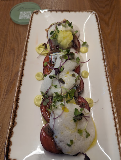 Read moreStumbled upon this delightful restaurant with an interesting menu and nice ambience, and I couldn't be happier! To start, kind of a take on a caprese salad, at least in structure: purple tomato slices topped with smoked sardines, minced apple sorbet, and an "escabeche" foam (vinegary, kind of like a ceviche marinade). My main course was a rice and pork dish typical of this area, paired with a red wine local to this area, of the bobal grape, which I'd never heard of before! For dessert, a "cream of cheese with red forest fruit"--like if panna cotta and cheesecake had a baby, and probably the best...