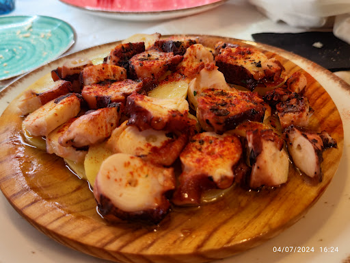 Otro imprescindible fue el “Pan, entrantes y el vino con jamón de bellota” (sí, el nombre ya es cautivador), que resultó ser un maridaje perfecto de sabores: un jamón de calidad impecable acompañado de un vino que parecía haber sido elegido con precisión matemática. La experiencia fue elevada aún más con unos huevos rotos con gambas que desbordaban sabor y frescura. 🍤🥚 La combinación de texturas y sabores en este plato demuestra que Miguel no solo tiene un horno legendario, sino también un paladar de oro.