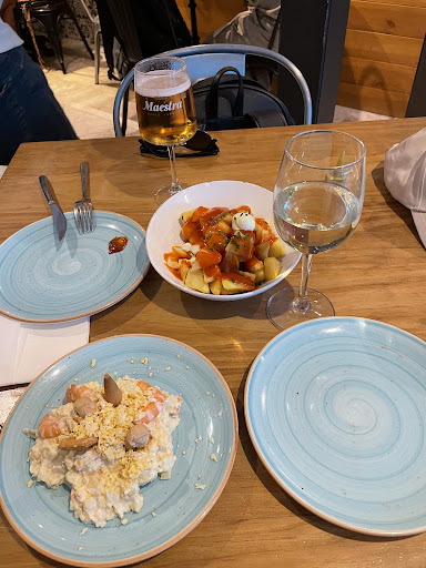 My husband and I both ordered the menu of the day for €18. This includes 2 courses, bread, beverage, and a dessert. We both ordered a glass of red wine. For the first course, my husband ordered the Salmorejo (tomato soup) with minced egg and I ordered the ensalada de judias verdes alinaras (tuna salad with green beans). For the second course, we both ordered the Carcamusas Toledanas (a very flavorful pork stew, a specialty of Toledo). For dessert, we both ordered the brownie which was more like a chocolate cake. The food was delicious and the service was good, I highly recommend...