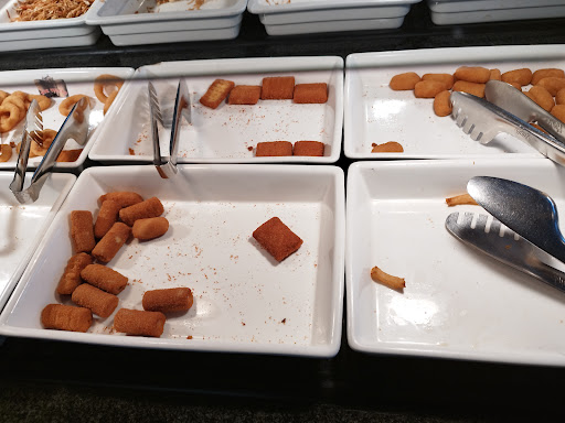 Tienen una enorme variedad. Que queréis que os diga, es un sitio de ir a comer mucho, no a comer excelente. Se come bien, está rico. Tienen una variedad tremenda. Puedes ir aún sin gustarte la comida estilo oriental, puesto que cuenta con una buena selección de pizzas hechas en el momento, ves todo el rato como trabajan la masa y la hornean, nada congelado. También tienen una buena variedad de arroces y carnes, desde codillo, costillas, churrasco, pollo hasta pescados y mariscos que te hacen en el momento.
