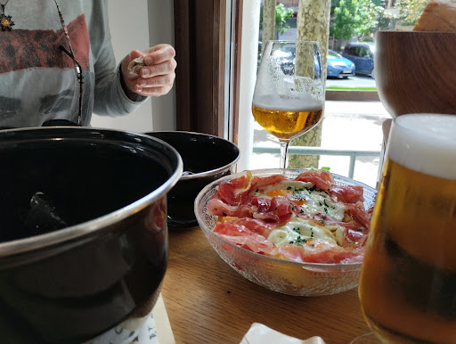 Read moreReally cool place! It’s the “Frontón”, the wall-tennis social centre of the town, where young people used to come to meet and fall in love. It dates back to 1890, but the renovation is only recent and very hip. Outside it looks Art Nouveau, with coloured-glass windows. We had the daily menu and it was great to get bread with it! The fresh asparagus were delicious and the crêpes were fantastic. I was sad the apple pie was finished as I would have liked to try it but the wine that came with the menu...