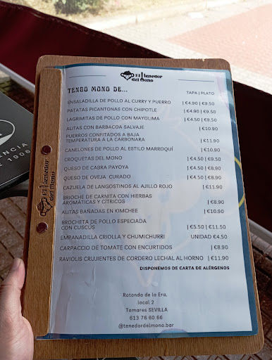 Read moreEspectacular descubrimiento en Tomares, primera vez que venimos al restaurante, un sitio pequeño,pero con amplia terraza con mesitas super acogedoras y muy buen ambiente. Tienen una buena carta para una amplia selección de platos y tapas, en los que probamos la ensaladilla de pollo al curry, muy original y gustosa, las lagrimitas de pollo con mayo Lima también buenísimas y jugosas, croquetas del mono muy cremosas, increíbles raviolis crujientes con mucho relleno y sabor, probamos bastantes cosas pero a destacar sin lugar a dudas las flores de alcachofa con la gostinos hyper gustosas y perfectamente hechas , y por último la lasaña crujiente de cochinita pilpil otro descubrimiento crujiente y con mucho sabor estilo marroquí. Los postres también estaban buenísimos, tanto la tarta de queso manchego, como la tarta del mono. El servicio fue excelente , tanto por parte de la camarera , como del dueño o encargado , una persona super amable y muy social. El precio es perfecto acorde con la cantidad y cálidad de la comida. Lo único es que es algo complicado el aparcamiento, pero nada que no merezca la pena por...