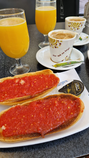 VEGANOS: Aunque no esté etiquetado como vegano, tiene opciones: tostada con tomate y aceite, zumo de naranja y café sólo, a veces hay leches vegetales de soja o avena.