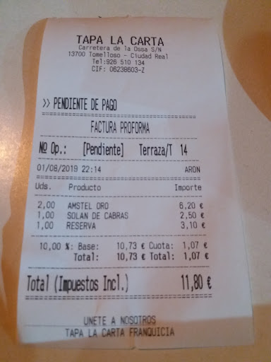 Read moreBar-Cervecería en Tomelloso, basado mas bien en tapeo. Cuando pides tú bebida, que suele estar en torno a los 4€, lleva incluida una tapa que eliges tú mismo, tienen una carta con bastantes tapas para elegir, algunas de ellas llevan incremento por ser un poco más confeccionadas. La calidad no son tapas gourmet, pero la verdad es que si lo que quieres es tomar algo y cenar con la tapa, aquí desde luego lo haces, son bastantes generosas. También disponen de carta para pedir, bocadillos, hamburguesas, raciones, etc... Las tapas también se pueden pedir sin consumición por 2,5€. Tienen una terraza bastante grande, el bar dentro es un poco más pequeño....