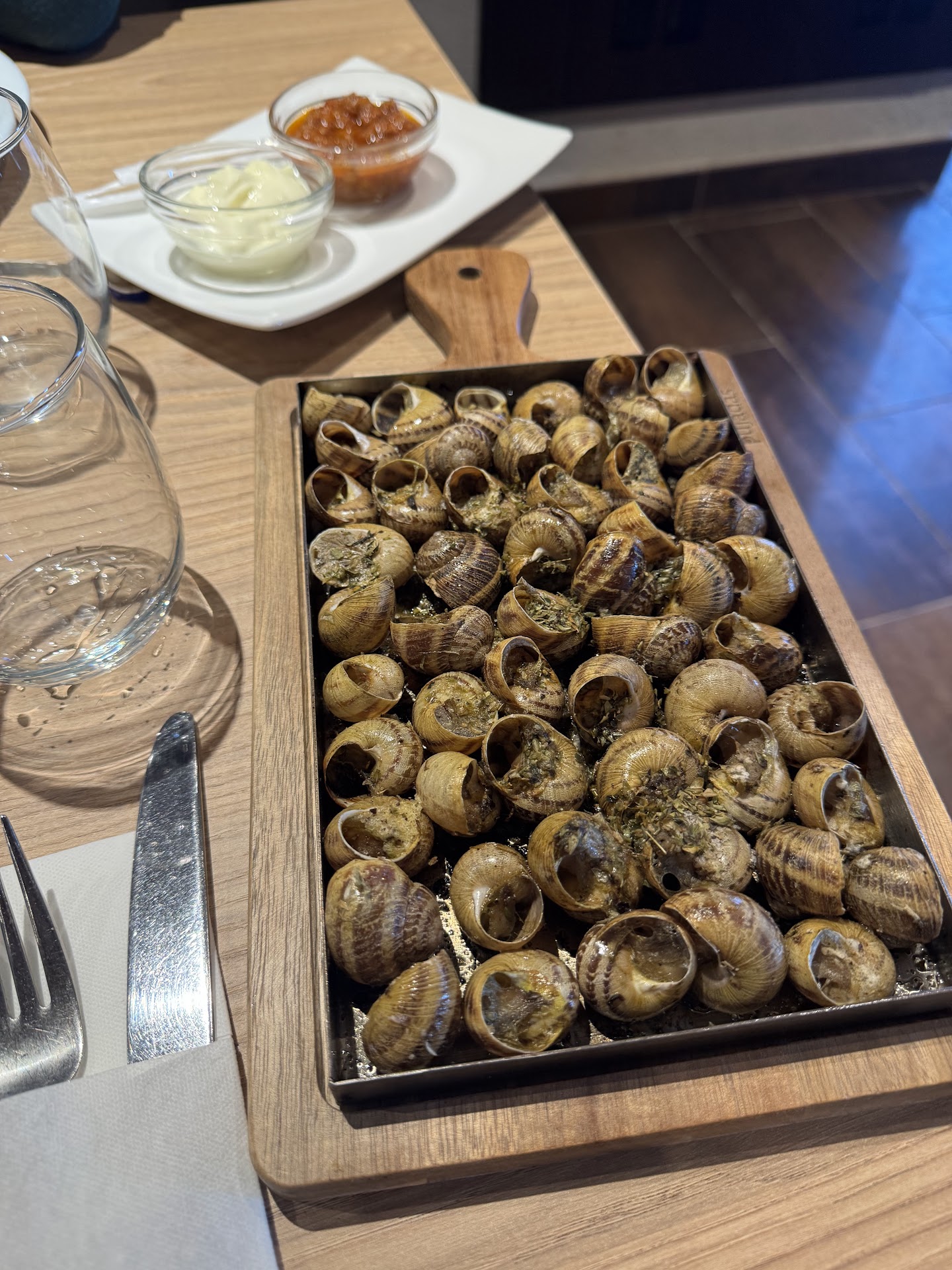 Quant al menjar, la sensació general va ser que no està a l’altura de l’espai. Els cargols a la llauna van arribar crus, i l’arròs sec amb butifarra i sèpia resultava massa oliós, amb una textura i un punt de cocció que no el feien gens atractiu. Pel que fa als postres, no els vam poder valorar, ja que l’experiència prèvia amb els plats principals no ens va animar a provar-los.