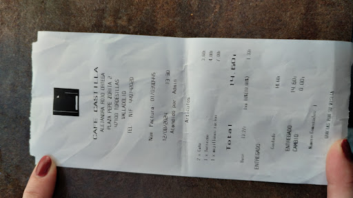 Read moreEsta mañana pedí café con tortilla y había tortilla de patatas normal o rellena de cangrejo, y elegí la rellena, me apetecía probarla porque en otro ocasión probé la normal y estaba muy buena. Mi sorpresa hoy cuando me trae la tortilla rellena que estaba pasada de hace 2 días mínimo (por eso la rellenan????), dura, de hecho no he podido comerla bien de lo dura que estaba y quemada, y sólo he comido en la interior y he dejado "la corteza" porque eso parecía corteza de lo duro que estaba, en el plato....
