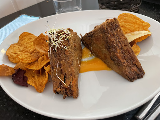 En esta ocasión probamos 3 platillos muy bien elaborados. Milhojas de patata brava con tres salsas distintas. Pani puri de morcilla con cebolla y cremoso de coliflor. Coca con crema de moniato, lima y ají acompañada con un filete de lubina y caramelo salado con...