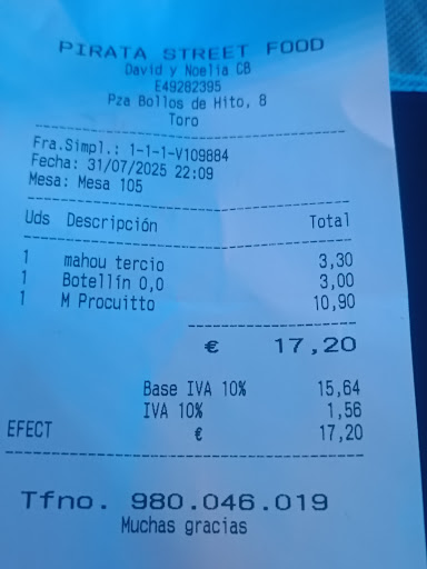 Read moreSi eres amante de las pizzas y las hamburguesas, El Pirata Street Food es un lugar que definitivamente debes visitar en la localidad de Toro. Este restaurante de comida rápida ha sabido combinar la rapidez del servicio con una calidad que sorprende desde el primer bocado. El local tiene un ambiente moderno y acogedor, que destaca por su impecable nivel de limpieza, ideal tanto para una comida rápida como para pasar un rato con amigos o en familia. El personal es amable y eficiente, pero sus dueños son la verdadera alma del lugar. Con una pasión evidente por la buena comida y el servicio excepcional, se aseguran de que cada detalle del restaurante, desde el menú hasta la experiencia del cliente, esté cuidadosamente pensado. Siempre están presentes para saludar a los comensales, asegurarse de que todo esté en orden y ofrecer un trato cercano que hace sentir a todos como en casa. Su dedicación y amor por lo que hacen se reflejan en la calidad de la comida y en la calidez...