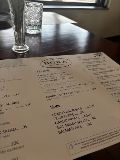 Read moreFamily of four visited Boka for dinner during our stay at Mar Menor Golf Resort. Overall we enjoyed the experience. Service was great and the menu is diverse. My only gripe was the portion sizes on the tapas / starters. We ordered a couple of things to share; olives from the tapas menu for €5 and calamari for €10 from the a la carte menu. There couldn't have been more than 10 olives and the calamari were served in a stainless steel flowerpot full of salad leaves with a tiny portion of smaller than bitesize squid and baby octopus on top. Very disappointing. Main courses were better. Cajun Entrecot was particularly nicely cooked and presented. Good place which just needs to work on the...