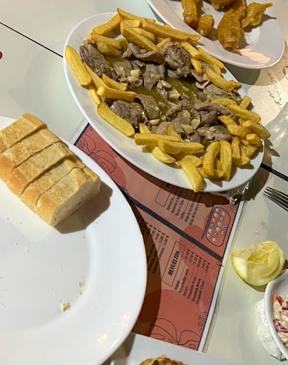 La comida siempre es buena y hay tapas con cada bebida hasta que pides raciones. Con suerte, puedes conseguir un asiento afuera en la calle justo en la plaza con un buen ambiente. Me gusta más el solomillo y las alcachofas. El servicio era más amable hace un tiempo, pero ha cambiado. No hay jabón en el baño muchas veces. En general es un buen lugar para la comida tradicional, que es buena pero no...