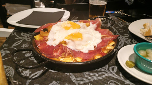 Pedimos al centro para compartir unas setas empanadas que estaban deliciosas, a destacar la salsa tipo césar o yogurt me impresionó, además de unos huevos rotos con jamón, venían en una sartén, bastante grande también y muy ricos, por último unos nachos que venían en una fuente de barro lo que permitió que no se enfriaran, venían con carne picada, queso, jalapeños (de los buenos) y otra rica salsa, pero no era guacamole, así que se lo pedimos a la camarera y en seguida nos trajo un poco de guacamole, todo en su punto (ojo a los jalapeños).