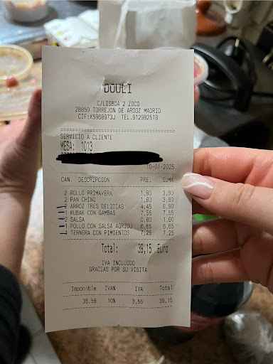Read moreMi experiencia la verdad ha sido pésima. Tenía tantas buenas reseñas que decidí probar, pero yo no he tenido esa suerte. El rollito de primavera chicloso y sin sabor ninguno. Solo era col. El arroz 3 delicias pasado y todo pegado, también soso. El pollo con almendras y la ternera con cebolla tenían el mismo color, la misma salsa y el mismo sabor. Podrían haber dicho que era cualquier otra cosa. Que por cierto, más de lo mismo, sabor ninguno. Encima el pollo ni si quiera olía bien. Lo único que pude comer y que menos mal, estaba bueno, fue el pato a la naranja. Espero que vosotros tengáis mejores experiencias, yo tuve que tirarlo todo. Dinero...