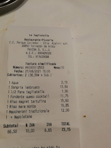 Read moreWe have been to other Tagliatelle restaurants but frankly the food in this one was quite disappointing - bolognese with hardly any meat to be seen, and the dish with focaccia didn’t have any (they had run out of focaccia, but didn’t think of flagging it). The waitresses on the other hand were friendly and tried to be helpful. Finally, at 25€ each, (1 glass of wine + 1 dish) it is not a cheap option - we won’t be coming back...