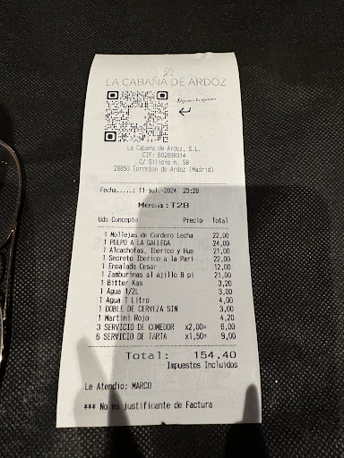 La verdad que a pesar de lo bonito que está y que he ido varias veces y la última vez pagué casi 30€ por un plato de jamón ibérico me lo pusieron seco y me dice un camarero que apenas tiene tiro y se seca y yo con mi cara de asombro . Ya no le doy más oportunidades a este sitio y más con lo que nos pasó anoche, llevé a mi familia a cenar y llevamos una pequeña tarta para soplar las velas a mi hijo que cumplía 22 años. La ensalada César super seca el pollo no se podía comer, el pulpo la patata super dura y el pulpo ni que decir, aquí dejo la cuenta porque al pagar ya que me aguante y no dije nada de la comida para no molestar a nadie y menos al camarero…….mi asombro de los 9€ (sin avisarnos de nada) que al ponernos platos y cucharas en este caso 6 nos cobraban servicio de tarta, que jamás lo había visto, que están en su derecho de cobrar lo que quieran, pero siempre avisando porque eso no aparecía en ningún lado. Y al quejarme y reclamar al camarero salió un señor como un toro sin educación y sin tacto a unos clientes a gritar y decir que paga impuestos y camareros y que paga esos platos que me sirve. Si es cierto que no los cobro la ensalada y si es cierto que yo un negocio tiene muchos gastos, soy empresaria también pero jamás hay que tratar así a los clientes y más que yo y mi familia en ningún momento les tratamos mal solo exigimos que nos parecía abusivo cobrar por traer unos platos y cucharas y más sin avisar, según el porque hay postres en el restaurante que ellos mismos nos guardaron la tarta y nos podían a ver dicho que no se puede llevar, en fin la comida fatal cada vez que voy y el servicio ya ni te cuento. No...