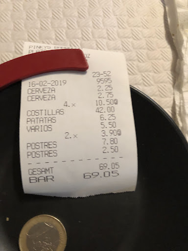 Read moreEl restaurante no es precisamente acogedor: se calienta con una estufa de butano, es un local antiguo aunque se observa que se ha remodelado el comedor. 📍el servicio es correcto, pero no hacen sugerencias ni son agradables. 📍la carta: muy escasa de productos y para tan poco género hay mucho producto congelado (jalapeños, nuggets, fingers de queso). 📍plato fuerte: costillas a la barbacoa. El precio por persona es de 10,5€, buena relación calidad-precio. Bien asado, con un excelente sabor. Acompañado por un buen plato de patatas fritas caseras con corte tipo “chips”, se cobran a parte. Estaban muy buenas. También vimos con muy buena cara el entrecot de 500 g por 20,5€. 📍postres: caseros solo tenían el flan (era un puding, muy pasable); crema de limón (no la probamos y brownie (el bizcocho tenía un sabor muy agradable con trocitos de nuez muy picados, aunque estaba hecho en exceso y la porción era muy pequeña). 👎🏻en pleno siglo XXI no se puede pagar con tarjeta. 👎🏻si quieres costillar, tienes que reservar. La cena de los 4 tuvo un precio de 69€. Muy buena carne y patatas, pero no...