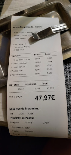 Tienen de fondo la misma músiquilla que hay en todos los restaurantes indios, con la particularidad de que la reproducen desde un teléfono móvil. ¿Que como lo sé? Bueno. Alguien llamó dos veces a ese teléfono mientras estuve comiendo allí, pero nadie contestó. Los comensales de las cuatro mesas ocupadas pudimos escuchar por los altavoces del restaurante el típico tono de un Samsung, insistentemente, hasta que el llamante colgo. Pusimos todos la misma cara, más o menos.