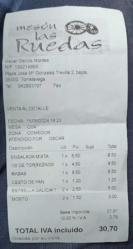 Por lo que recomendamos que si vais o pasais por Torrelavega hagais una visita y degusteis el buen trato y la buena comida del Meson Las ruedas.