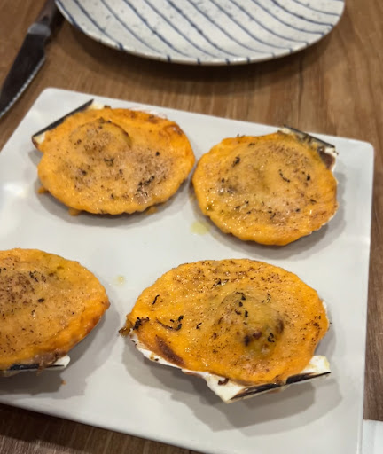 Zamburiñas gratinadas con algas que estaban muy muy ricas, chipirones en 2 texturas destacar el alioli de lima muy rico, y el tercer plato eran pimientos verdes rellenos de morcilla y setas con salsa de pimiento rojo, nos resultaron algo empalagosos es solo para comerse un pimiento.